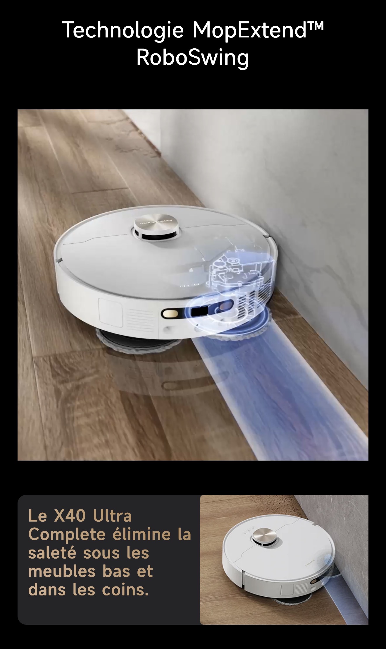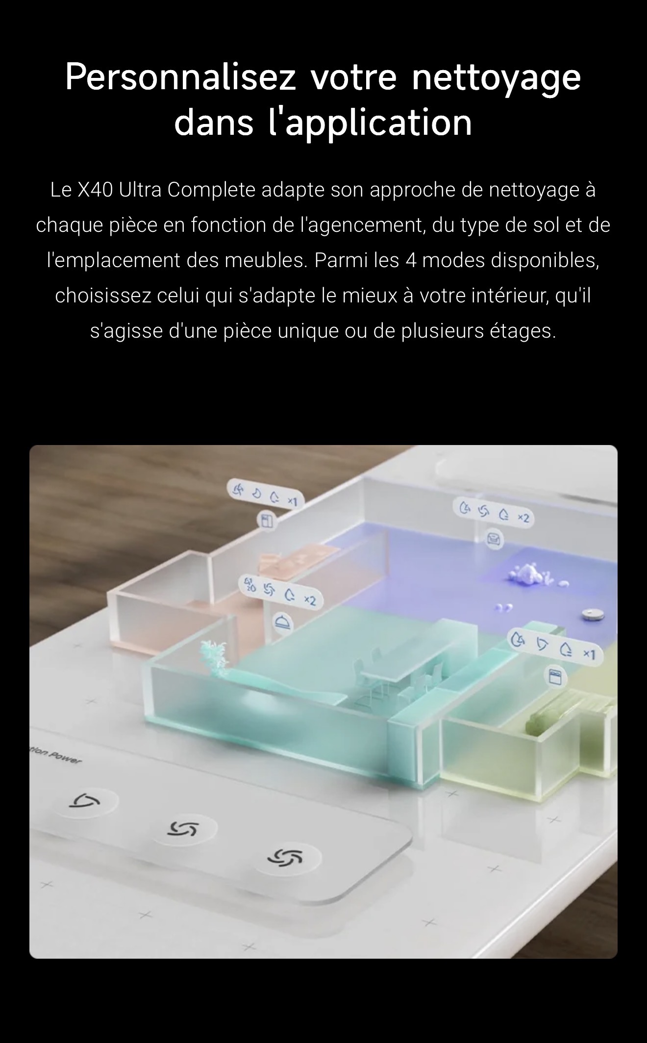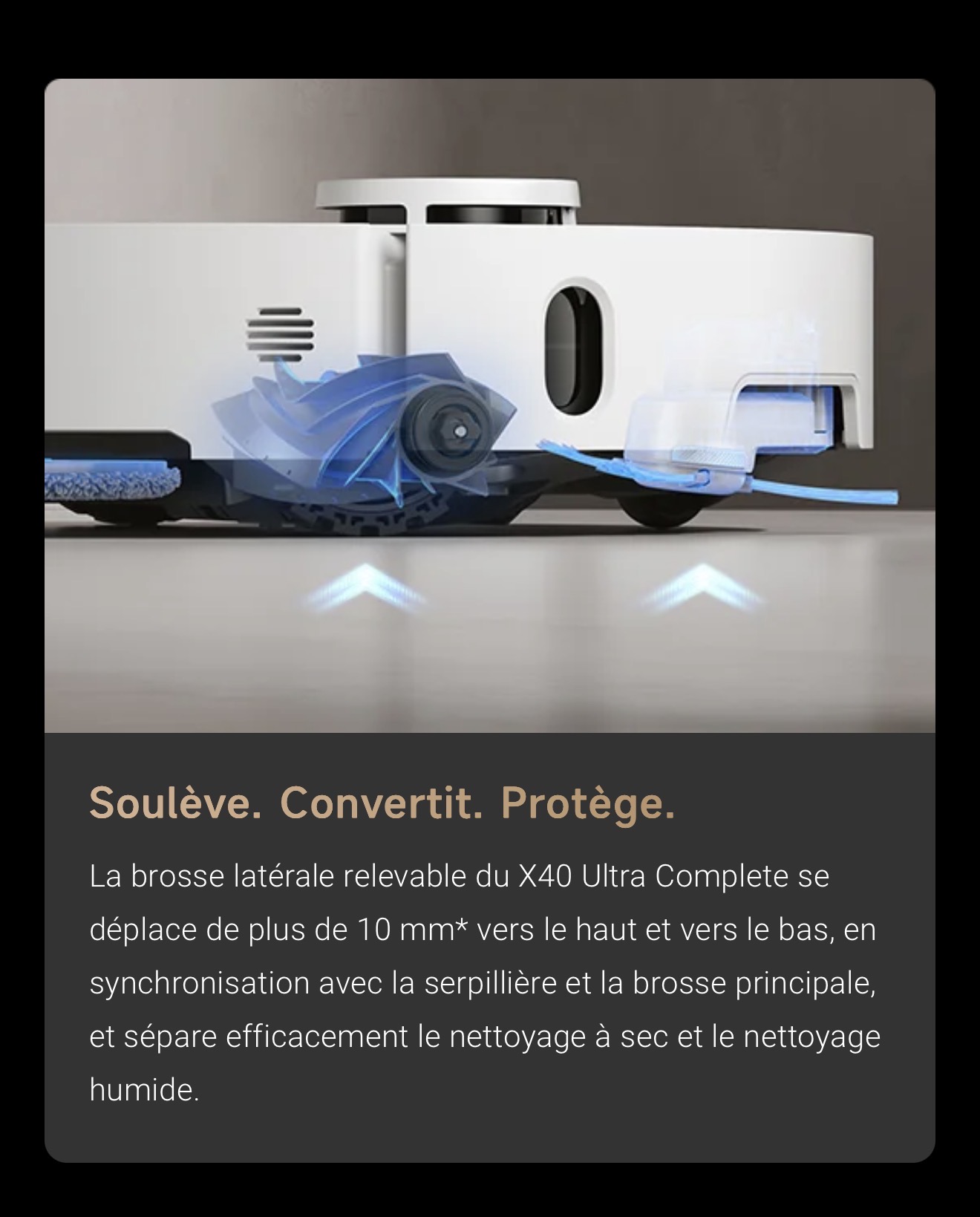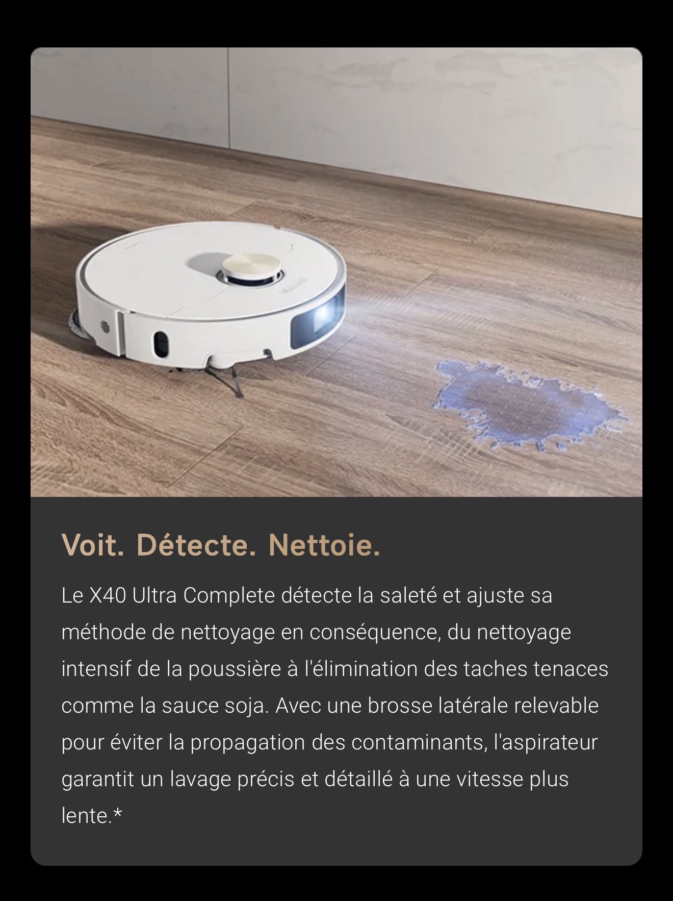 Le capteur couleur mesure précisément la saleté de l'eau, garantissant ainsi un second lavage de la serpillière pour éliminer efficacement les taches. Le X40 Ultra Complete double le lavage des sols pour plus de fraîcheur.