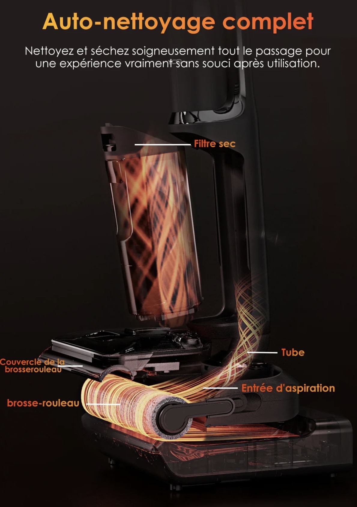 Utilise de l'eau douce chauffée pour dissoudre efficacement les taches du tuyau à la brosse-rouleau, puis utilise de l'air chaud à 85°C pour sécher efficacement chaque partie de la Aspirateur Laveur. Pour une absence de souci après utilisation.