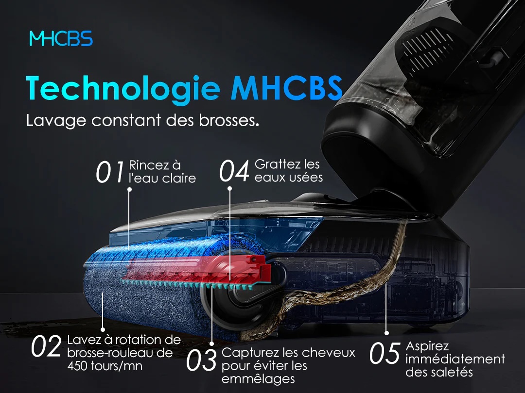 Aspirateur Laveur sans Fil, les grattoirs à double couche empêchent les cheveux de s'emmêler et de boucher le tuyau en capturant les cheveux avec un grattoir et en essuyant l'eau sale et les cheveux à l'aide d'un grattoir droit.