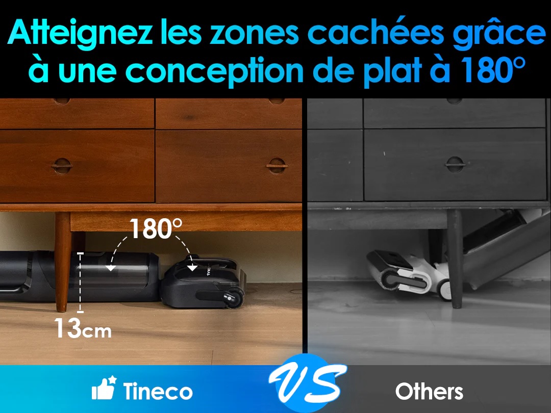 Aspirateur Laveur, s'incline sans effort jusqu'à 180°, permettant de passer facilement sous les meubles ou dans les zones basses pour nettoyer la poussière cachée.