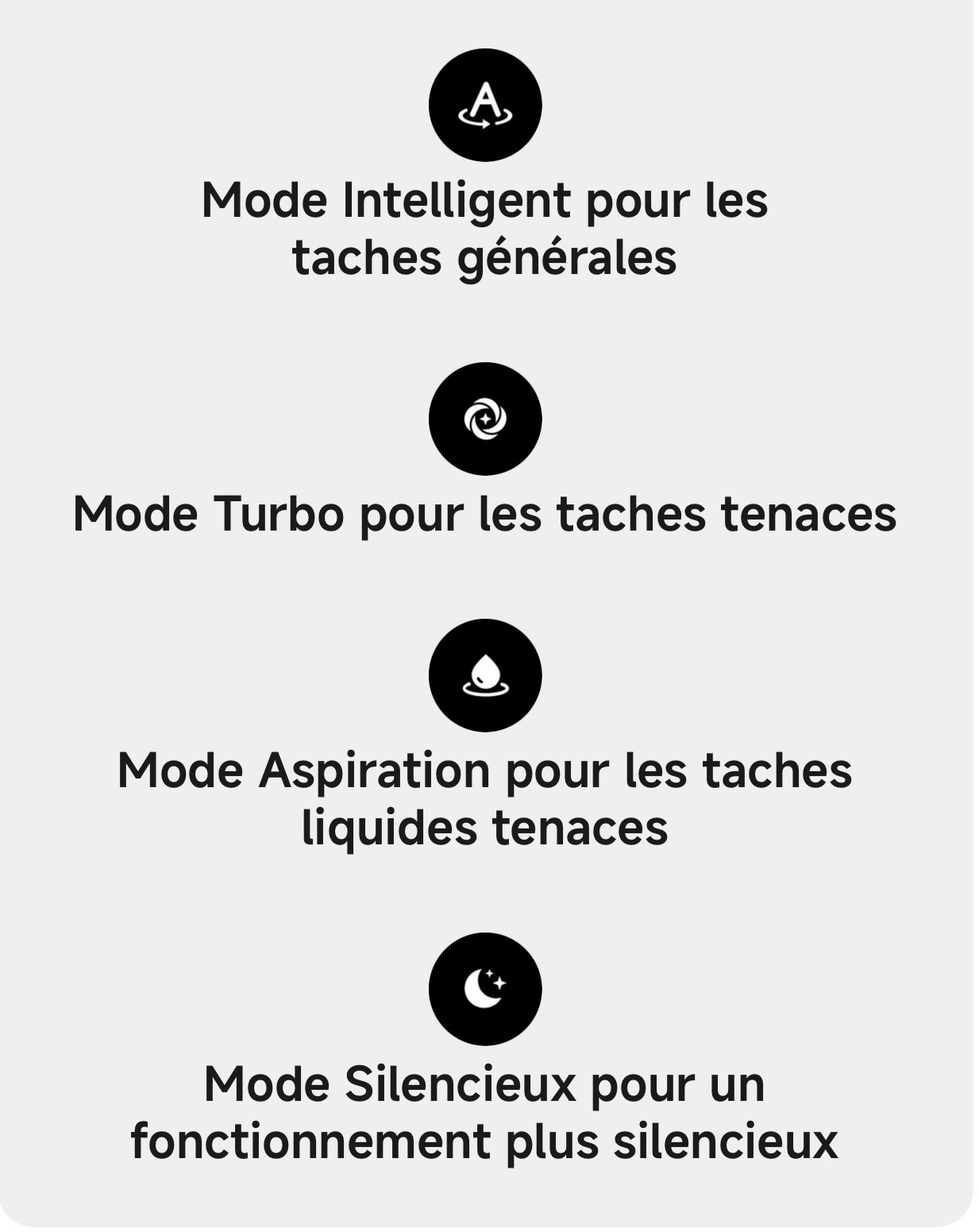 Modes de nettoyage Intelligent/Aspiration/Turbo/Silencieux