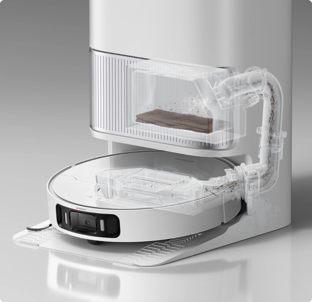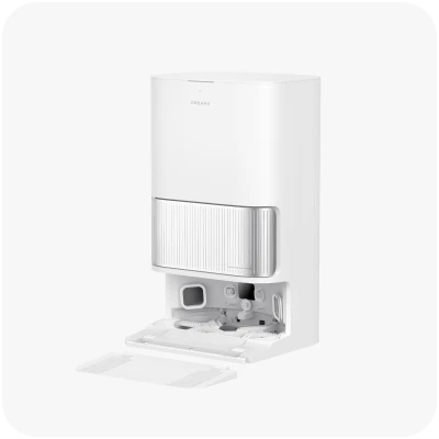 Vider le bac à poussière est un jeu d'enfant ! Le robot aspirateur vide automatiquement la poussière dans un grand sac à poussière de 3,2 L situé dans la staion d'accueil, pour une facilité d'entretien jusqu'à 100 jours*.