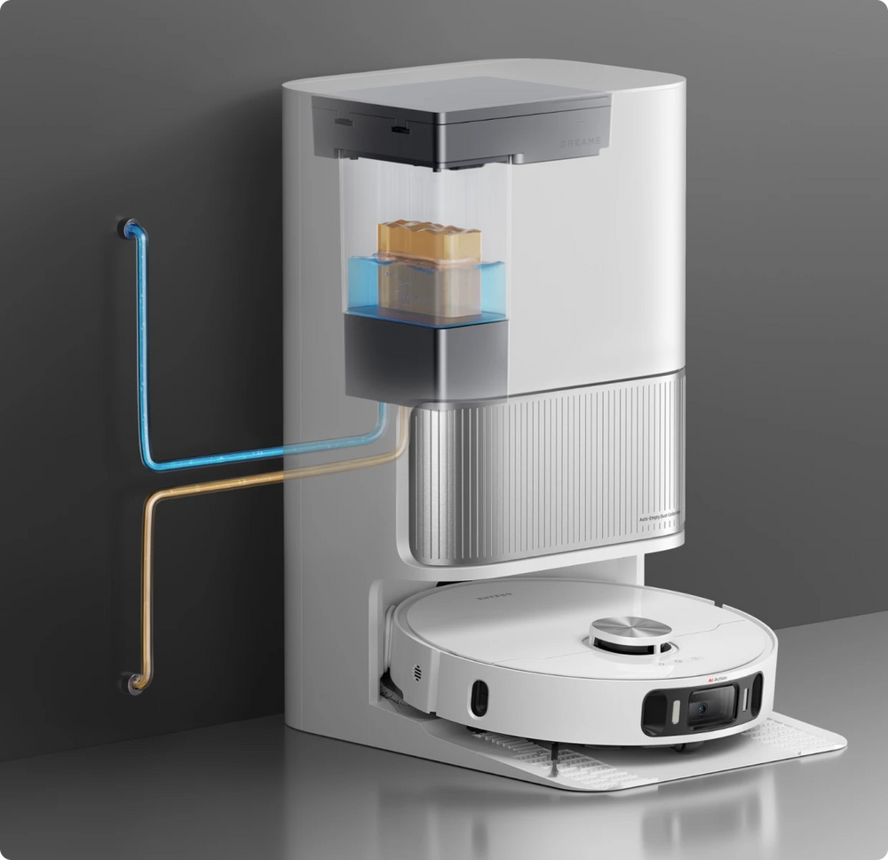 Le robot aspirateur sait quand ajouter de l'eau, garantissant ainsi une alimentation en eau constante pour un lavage des sols sans interruption. La station d'accueil recharge le réservoir de l'aspirateur avec de l'eau propre. Ainsi, les serpillières sont toujours prêtes à l'emploi!