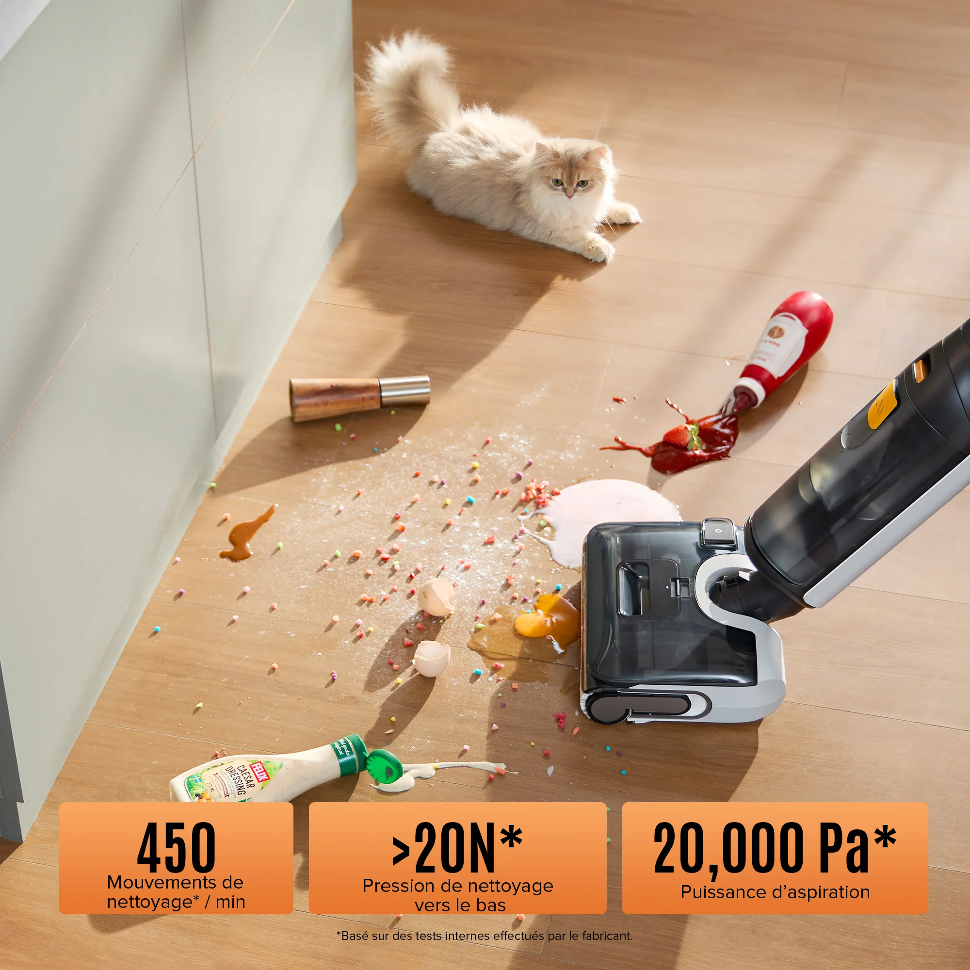 1. Puissance d'aspiration : 20 000 Pa – offre une aspiration puissante permettant un nettoyage en profondeur sur diverses surfaces.