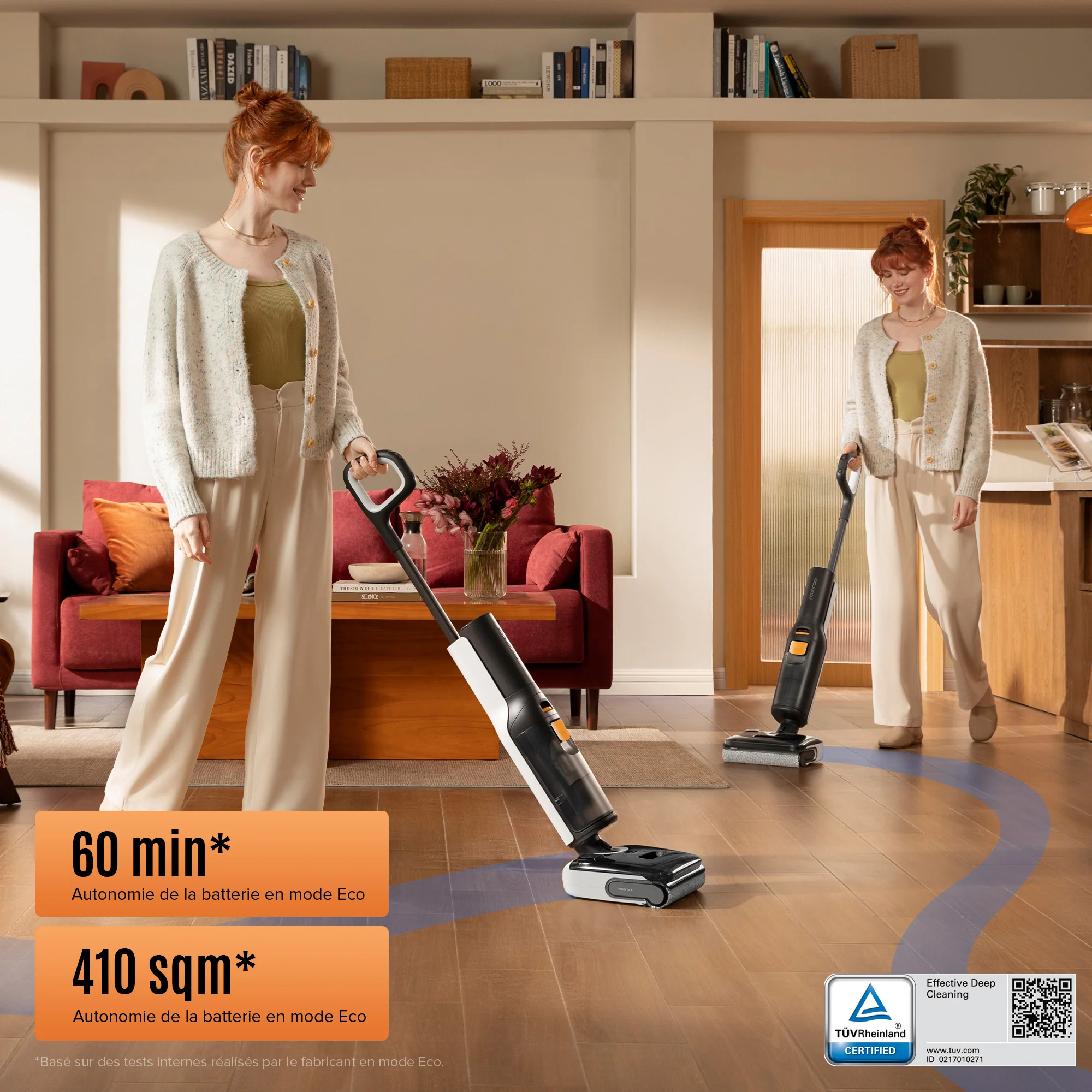 7. Autonomie : 40 minutes (mode Auto) – offre une longue durée de fonctionnement pour nettoyer des surfaces importantes sans interruption.